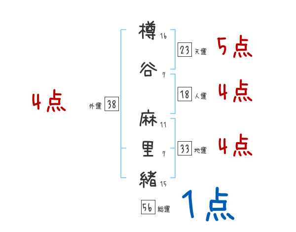 天運![]() | 樽谷麻里緒さんの天運は23画の5つ星!想像力に優れ活力がある。一代で成功し名誉を手に入れる。 家系が持つ宿命的な運勢を表します。祖先から受け継いだ苗字ですので自分の力が及びません。家柄を象徴します。 |