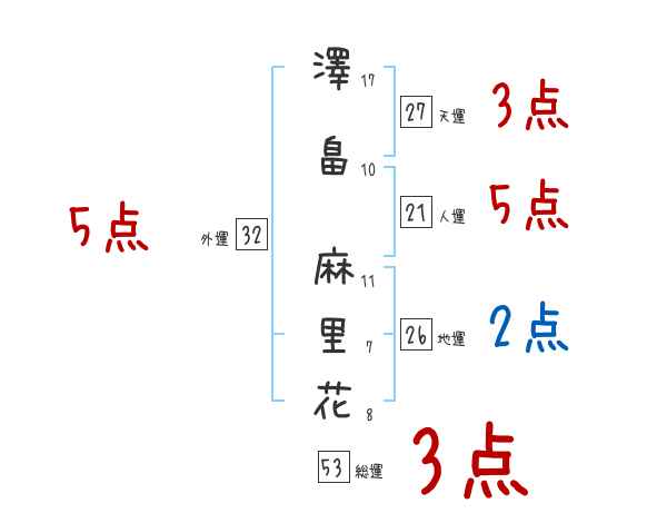 外運![]() | 澤畠麻里花さんの外運は32画の5つ星!柔軟性があり成功する。チャンスが多く金運が良い。 生活面を象徴する運勢です。外部から受ける影響力を表し、結婚運、家庭運や職場、環境への順応性を表します。 |