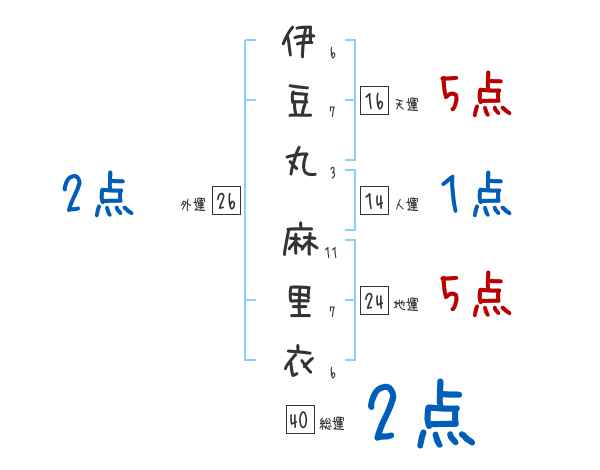 天運![]() | 伊豆丸麻里衣さんの天運は16画の5つ星!人望が厚く大きく発展する。逆転成功が見える。 家系が持つ宿命的な運勢を表します。祖先から受け継いだ苗字ですので自分の力が及びません。家柄を象徴します。 |