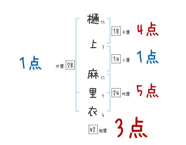 天運![]() | 樋上麻里衣さんの天運は18画の4つ星!情熱的で剛気。忍耐力があり信頼される。 家系が持つ宿命的な運勢を表します。祖先から受け継いだ苗字ですので自分の力が及びません。家柄を象徴します。 |