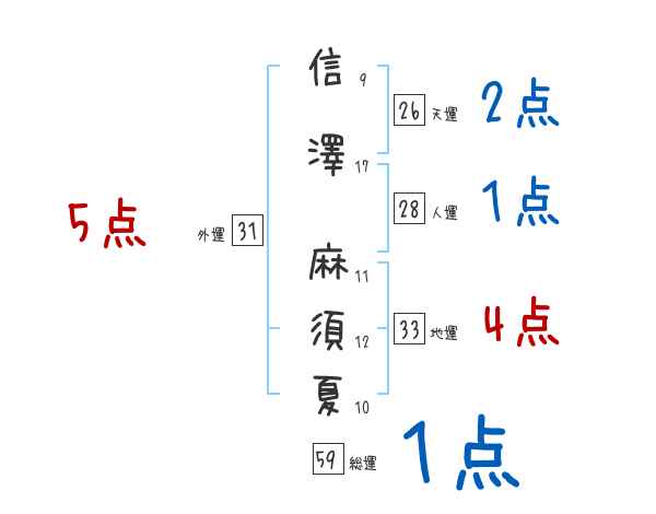 外運![]() | 信澤麻須夏さんの外運は31画の5つ星!社交性があり判断力に優れる。順風満帆な人生で円満な生活。 生活面を象徴する運勢です。外部から受ける影響力を表し、結婚運、家庭運や職場、環境への順応性を表します。 |