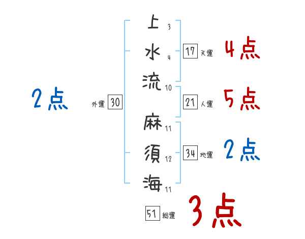外運![]() | 上水流麻須海さんの外運は30画の2つ星!浮き沈みの激しさに注意しましょう。 生活面を象徴する運勢です。外部から受ける影響力を表し、結婚運、家庭運や職場、環境への順応性を表します。 |