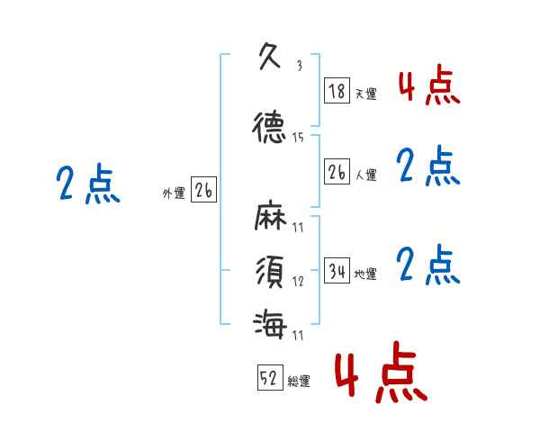 天運![]() | 久德麻須海さんの天運は18画の4つ星!情熱的で剛気。忍耐力があり信頼される。 家系が持つ宿命的な運勢を表します。祖先から受け継いだ苗字ですので自分の力が及びません。家柄を象徴します。 |
