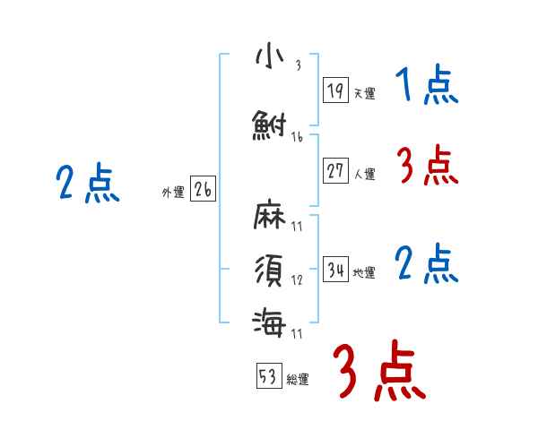 外運![]() | 小鮒麻須海さんの外運は26画の2つ星!波瀾万丈かも。信頼できる人を大事にしましょう。 生活面を象徴する運勢です。外部から受ける影響力を表し、結婚運、家庭運や職場、環境への順応性を表します。 |