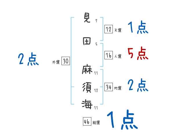 人運![]() | 見田麻須海さんの人運は16画の5つ星!人望が厚く大きく発展する。逆転成功が見える。 性格や才能などを表す2番目に重要な運勢です。人間関係や協調性、社会的な成功に影響します。主に20歳から50歳ぐらいまでの中年期の運勢を表します。 |