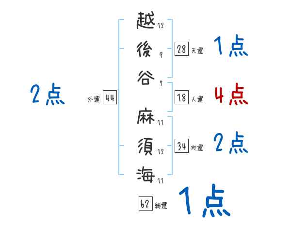 天運![]() | 越後谷麻須海さんの天運は28画の1つ星!家庭環境に注意。スポーツで活躍できる能力があるかも。 家系が持つ宿命的な運勢を表します。祖先から受け継いだ苗字ですので自分の力が及びません。家柄を象徴します。 |