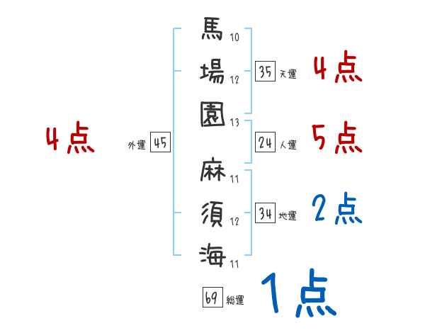 天運![]() | 馬場園麻須海さんの天運は35画の4つ星!温厚な性格で感受性が高い。穏和な性格で人望が厚い。 家系が持つ宿命的な運勢を表します。祖先から受け継いだ苗字ですので自分の力が及びません。家柄を象徴します。 |