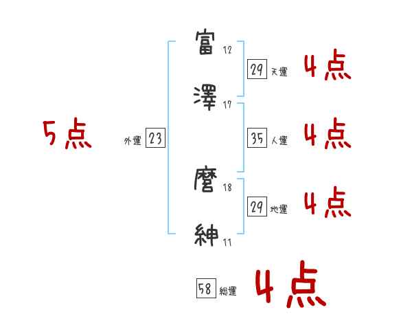 総運![]() | 富澤麿紳さんの総運は58画の4つ星!安定した生活。大器晩成タイプ。 あなたの人生を表す1番重要な運勢です。生涯を通じて影響する総合運となり、主に50歳以降の晩年期に影響を及ぼします。 |