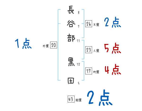 天運![]() | 長谷部黒田さんの天運は26画の2つ星!波瀾万丈かも。信頼できる人を大事にしましょう。 家系が持つ宿命的な運勢を表します。祖先から受け継いだ苗字ですので自分の力が及びません。家柄を象徴します。 |