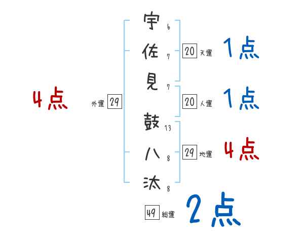 総運![]() | 宇佐見鼓八汰さんの総運は49画の2つ星!不安定な性格で明暗がある人生。周りの人には支援されやすい。 あなたの人生を表す1番重要な運勢です。生涯を通じて影響する総合運となり、主に50歳以降の晩年期に影響を及ぼします。 |