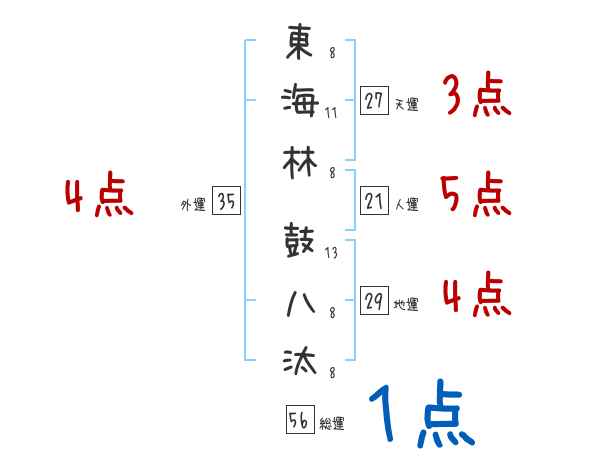 天運![]() | 東海林鼓八汰さんの天運は27画の3つ星!頭脳明晰だが強情で摩擦が多い傾向。孤立に注意。 家系が持つ宿命的な運勢を表します。祖先から受け継いだ苗字ですので自分の力が及びません。家柄を象徴します。 |