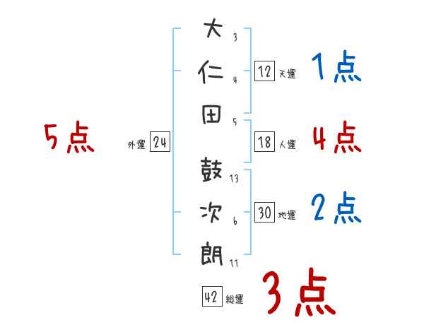 天運![]() | 大仁田鼓次朗さんの天運は12画の1つ星!簡単な失敗で諦めてしまいやすいかも。着実に行動すると良いでしょう。 家系が持つ宿命的な運勢を表します。祖先から受け継いだ苗字ですので自分の力が及びません。家柄を象徴します。 |
