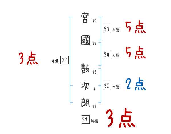 総運![]() | 宮國鼓次朗さんの総運は51画の3つ星!変化が激しく、危険に注意。堅実な性格。 あなたの人生を表す1番重要な運勢です。生涯を通じて影響する総合運となり、主に50歳以降の晩年期に影響を及ぼします。 |
