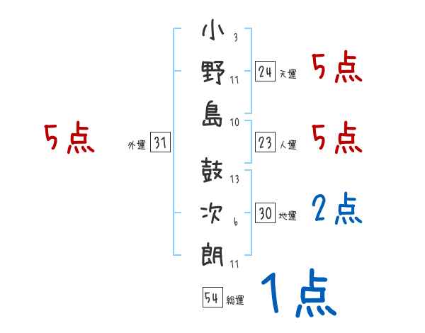 総運![]() | 小野島鼓次朗さんの総運は54画の1つ星!トラブルが多いかも。周りをよく見て協調して過ごしましょう。 あなたの人生を表す1番重要な運勢です。生涯を通じて影響する総合運となり、主に50歳以降の晩年期に影響を及ぼします。 |