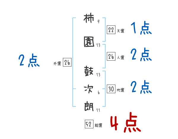 総運![]() | 柿園鼓次朗さんの総運は52画の4つ星!先見性と独創性に優れ考える力がある。強運の持ち主。 あなたの人生を表す1番重要な運勢です。生涯を通じて影響する総合運となり、主に50歳以降の晩年期に影響を及ぼします。 |