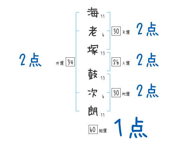 総運![]() | 海老塚鼓次朗さんの総運は60画の1つ星!悲観的で迷いやすい。波乱が多く損をしないように。 あなたの人生を表す1番重要な運勢です。生涯を通じて影響する総合運となり、主に50歳以降の晩年期に影響を及ぼします。 |