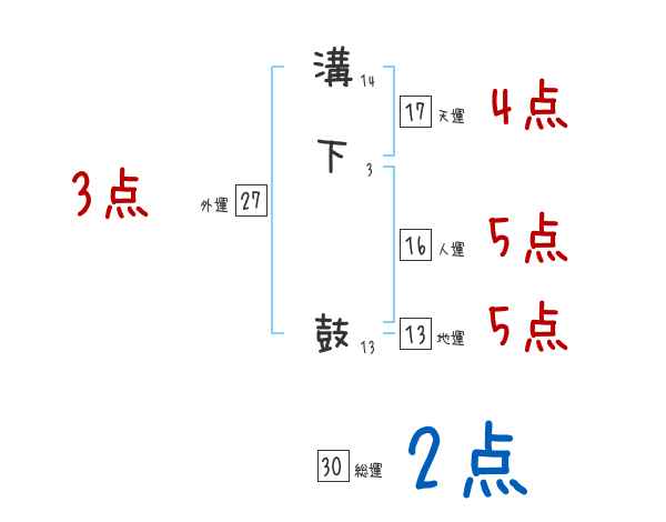 天運![]() | 溝下鼓さんの天運は17画の4つ星!積極的な行動力。地位を気づき財産を手に入れる。純粋な心と直感力。 家系が持つ宿命的な運勢を表します。祖先から受け継いだ苗字ですので自分の力が及びません。家柄を象徴します。 |
