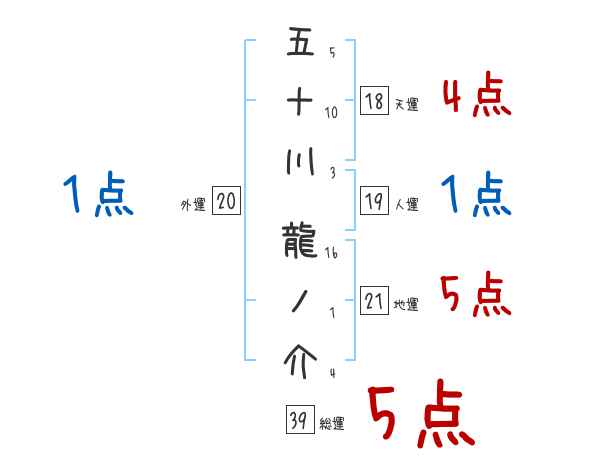 総運![]() | 五十川龍ノ介さんの総運は39画の5つ星!社交性に優れ人望が厚い。人の上に立ち成功する。 あなたの人生を表す1番重要な運勢です。生涯を通じて影響する総合運となり、主に50歳以降の晩年期に影響を及ぼします。 |
