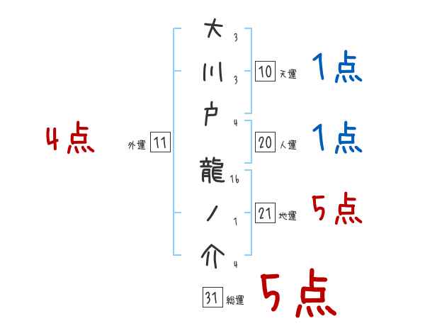 外運![]() | 大川戸龍ノ介さんの外運は11画の4つ星!着実に富や地位を得る幸運な人生。 生活面を象徴する運勢です。外部から受ける影響力を表し、結婚運、家庭運や職場、環境への順応性を表します。 |
