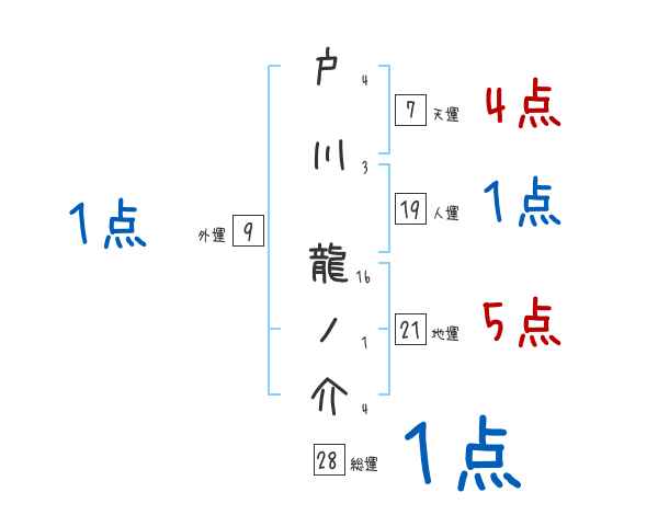 天運![]() | 戸川龍ノ介さんの天運は7画の4つ星!強い意志や信念を持ち独立心が強い。自立する。 家系が持つ宿命的な運勢を表します。祖先から受け継いだ苗字ですので自分の力が及びません。家柄を象徴します。 |