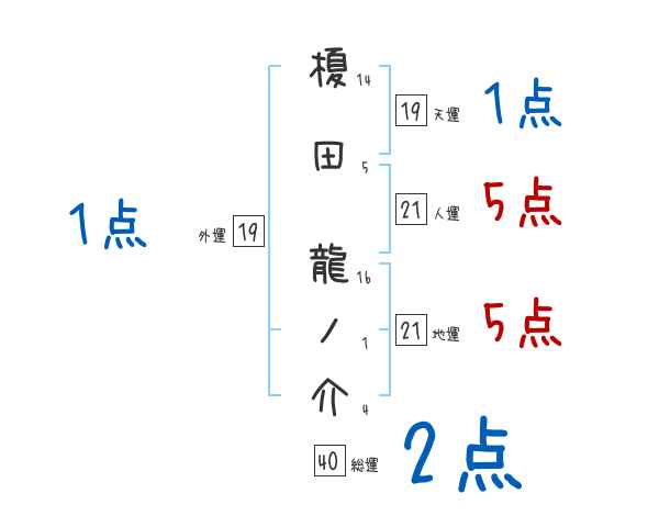 天運![]() | 榎田龍ノ介さんの天運は19画の1つ星!優れた才能を持ちますが、協調性が足りないことも。周りの人と協力する事を意識しましょう。 家系が持つ宿命的な運勢を表します。祖先から受け継いだ苗字ですので自分の力が及びません。家柄を象徴します。 |