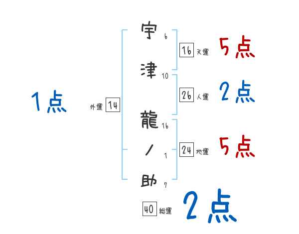 天運![]() | 宇津龍ノ助さんの天運は16画の5つ星!人望が厚く大きく発展する。逆転成功が見える。 家系が持つ宿命的な運勢を表します。祖先から受け継いだ苗字ですので自分の力が及びません。家柄を象徴します。 |