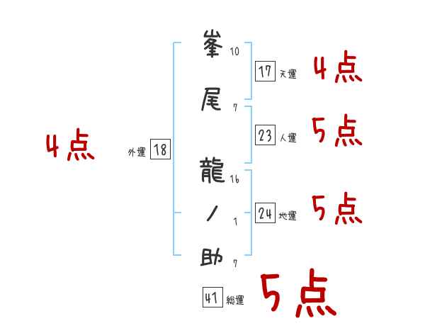 天運![]() | 峯尾龍ノ助さんの天運は17画の4つ星!積極的な行動力。地位を気づき財産を手に入れる。純粋な心と直感力。 家系が持つ宿命的な運勢を表します。祖先から受け継いだ苗字ですので自分の力が及びません。家柄を象徴します。 |