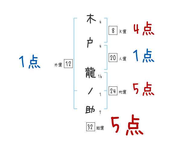 総運![]() | 木戸龍ノ助さんの総運は32画の5つ星!柔軟性があり成功する。チャンスが多く金運が良い。 あなたの人生を表す1番重要な運勢です。生涯を通じて影響する総合運となり、主に50歳以降の晩年期に影響を及ぼします。 |