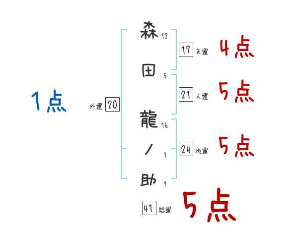 天運![]()  | 森田龍ノ助さんの天運は17画の4つ星!積極的な行動力。地位を気づき財産を手に入れる。純粋な心と直感力。 家系が持つ宿命的な運勢を表します。祖先から受け継いだ苗字ですので自分の力が及びません。家柄を象徴します。 |