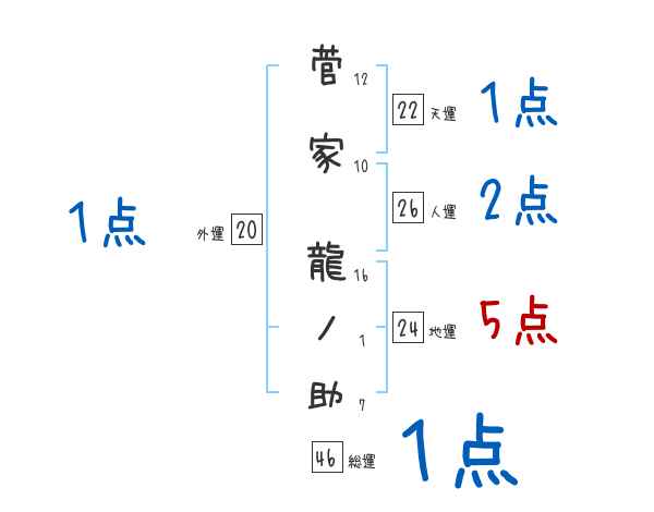 総運![]() | 菅家龍ノ助さんの総運は46画の1つ星!迷走することが多く苦労するかも。目先のことにとらわれないように。 あなたの人生を表す1番重要な運勢です。生涯を通じて影響する総合運となり、主に50歳以降の晩年期に影響を及ぼします。 |