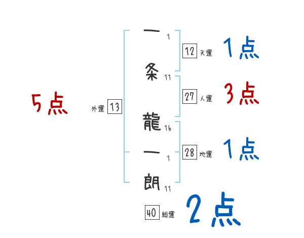天運![]() | 一条龍一朗さんの天運は12画の1つ星!簡単な失敗で諦めてしまいやすいかも。着実に行動すると良いでしょう。 家系が持つ宿命的な運勢を表します。祖先から受け継いだ苗字ですので自分の力が及びません。家柄を象徴します。 |