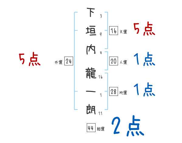 総運![]() | 下垣内龍一朗さんの総運は44画の2つ星!誠実で慎重な性格。物事を考えすぎないように注意しましょう。 あなたの人生を表す1番重要な運勢です。生涯を通じて影響する総合運となり、主に50歳以降の晩年期に影響を及ぼします。 |
