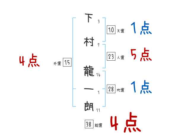 天運![]() | 下村龍一朗さんの天運は10画の1つ星!不安を感じやすい傾向。ストレスを抱えないように注意しましょう。 家系が持つ宿命的な運勢を表します。祖先から受け継いだ苗字ですので自分の力が及びません。家柄を象徴します。 |