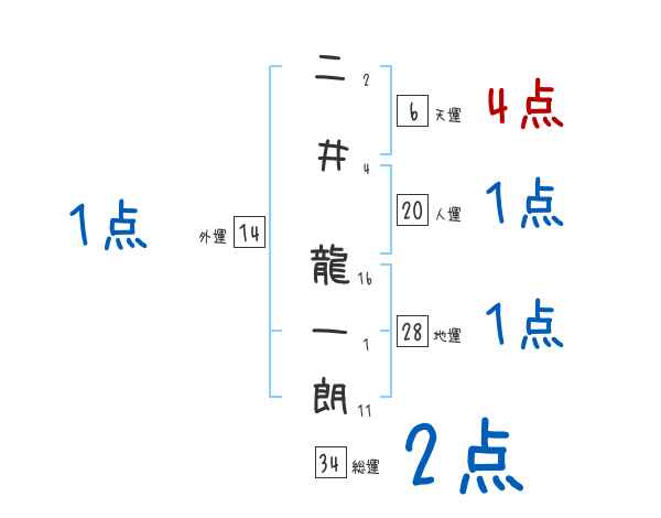 | 総運  | 二井龍一朗さんの総運は34画の2つ星!独創性に優れるが、自尊心が強く災難に注意しましょう。あなたの人生を表す1番重要な運勢です。生涯を通じて影響する総合運となり、主に50歳以降の晩年期に影響を及ぼします。 |