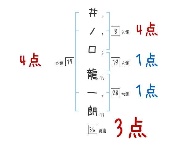 外運![]() | 井ノ口龍一朗さんの外運は17画の4つ星!積極的な行動力。地位を気づき財産を手に入れる。純粋な心と直感力。 生活面を象徴する運勢です。外部から受ける影響力を表し、結婚運、家庭運や職場、環境への順応性を表します。 |