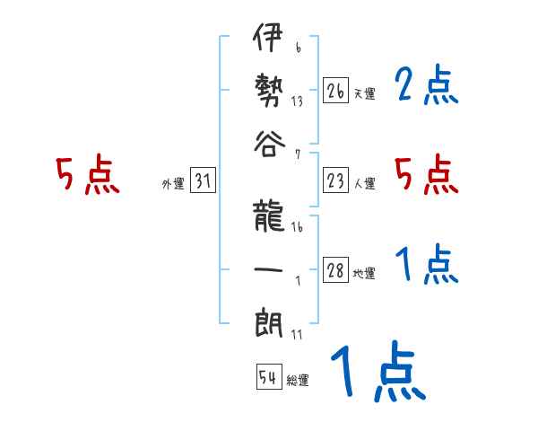 人運![]() | 伊勢谷龍一朗さんの人運は23画の5つ星!想像力に優れ活力がある。一代で成功し名誉を手に入れる。 性格や才能などを表す2番目に重要な運勢です。人間関係や協調性、社会的な成功に影響します。主に20歳から50歳ぐらいまでの中年期の運勢を表します。 |
