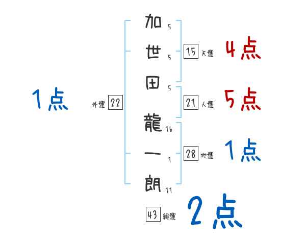 外運![]() | 加世田龍一朗さんの外運は22画の1つ星!努力することが苦手ないっぽう手先が器用。芸術性にも優れる。 生活面を象徴する運勢です。外部から受ける影響力を表し、結婚運、家庭運や職場、環境への順応性を表します。 |