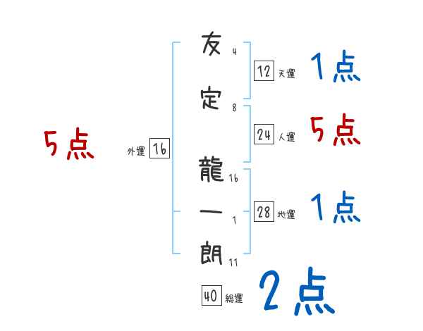 外運![]() | 友定龍一朗さんの外運は16画の5つ星!人望が厚く大きく発展する。逆転成功が見える。 生活面を象徴する運勢です。外部から受ける影響力を表し、結婚運、家庭運や職場、環境への順応性を表します。 |