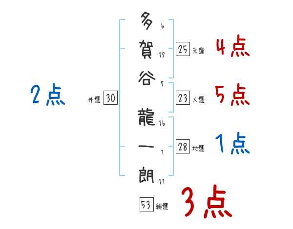 総運![]() | 多賀谷龍一朗さんの総運は53画の3つ星!やや見栄っ張りで虚栄心がある。散財に注意。 あなたの人生を表す1番重要な運勢です。生涯を通じて影響する総合運となり、主に50歳以降の晩年期に影響を及ぼします。 |