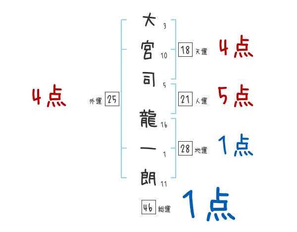 天運![]() | 大宮司龍一朗さんの天運は18画の4つ星!情熱的で剛気。忍耐力があり信頼される。 家系が持つ宿命的な運勢を表します。祖先から受け継いだ苗字ですので自分の力が及びません。家柄を象徴します。 |