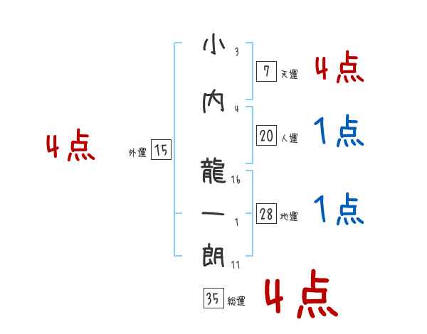 天運![]() | 小内龍一朗さんの天運は7画の4つ星!強い意志や信念を持ち独立心が強い。自立する。 家系が持つ宿命的な運勢を表します。祖先から受け継いだ苗字ですので自分の力が及びません。家柄を象徴します。 |