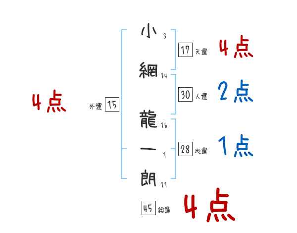 天運![]() | 小網龍一朗さんの天運は17画の4つ星!積極的な行動力。地位を気づき財産を手に入れる。純粋な心と直感力。 家系が持つ宿命的な運勢を表します。祖先から受け継いだ苗字ですので自分の力が及びません。家柄を象徴します。 |