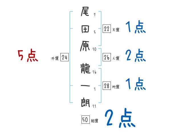 外運![]() | 尾田原龍一朗さんの外運は24画の5つ星!家庭運が良く順調な人生。金運にも恵まれる。 生活面を象徴する運勢です。外部から受ける影響力を表し、結婚運、家庭運や職場、環境への順応性を表します。 |