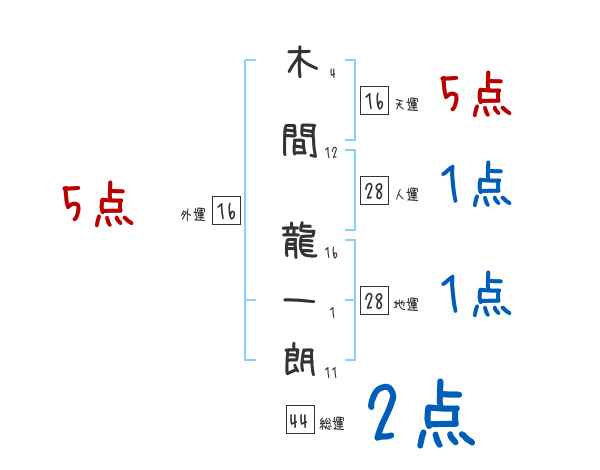 外運![]() | 木間龍一朗さんの外運は16画の5つ星!人望が厚く大きく発展する。逆転成功が見える。 生活面を象徴する運勢です。外部から受ける影響力を表し、結婚運、家庭運や職場、環境への順応性を表します。 |