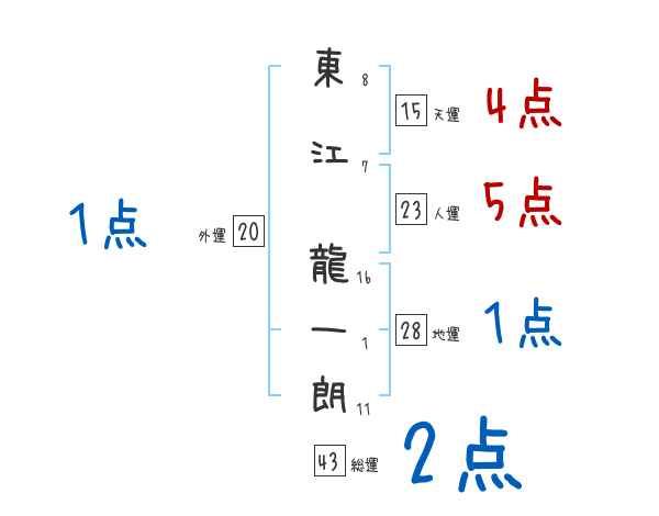 | 人運  | 東江龍一朗さんの人運は23画の5つ星!想像力に優れ活力がある。一代で成功し名誉を手に入れる。性格や才能などを表す2番目に重要な運勢です。人間関係や協調性、社会的な成功に影響します。主に20歳から50歳ぐらいまでの中年期の運勢を表します。 |