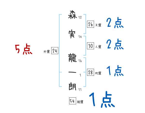 外運![]() | 森実龍一朗さんの外運は24画の5つ星!家庭運が良く順調な人生。金運にも恵まれる。 生活面を象徴する運勢です。外部から受ける影響力を表し、結婚運、家庭運や職場、環境への順応性を表します。 |