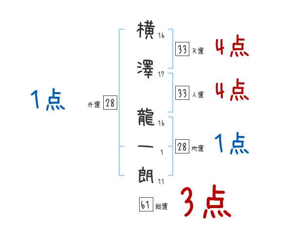 外運![]() | 横澤龍一朗さんの外運は28画の1つ星!家庭環境に注意。スポーツで活躍できる能力があるかも。 生活面を象徴する運勢です。外部から受ける影響力を表し、結婚運、家庭運や職場、環境への順応性を表します。 |