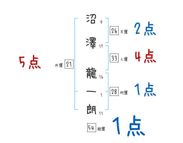 外運![]() | 沼澤龍一朗さんの外運は21画の5つ星!統率力がある。独立し成功する。名誉を手に入れる。 生活面を象徴する運勢です。外部から受ける影響力を表し、結婚運、家庭運や職場、環境への順応性を表します。 |