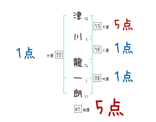 外運![]() | 津川龍一朗さんの外運は22画の1つ星!努力することが苦手ないっぽう手先が器用。芸術性にも優れる。 生活面を象徴する運勢です。外部から受ける影響力を表し、結婚運、家庭運や職場、環境への順応性を表します。 |