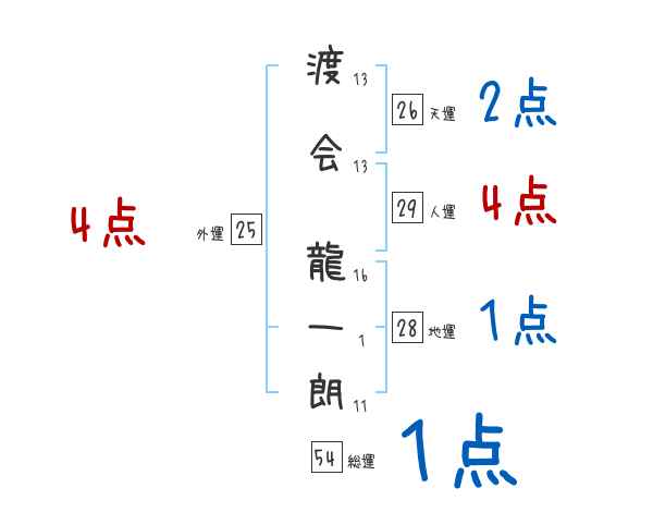 天運![]() | 渡会龍一朗さんの天運は26画の2つ星!波瀾万丈かも。信頼できる人を大事にしましょう。 家系が持つ宿命的な運勢を表します。祖先から受け継いだ苗字ですので自分の力が及びません。家柄を象徴します。 |